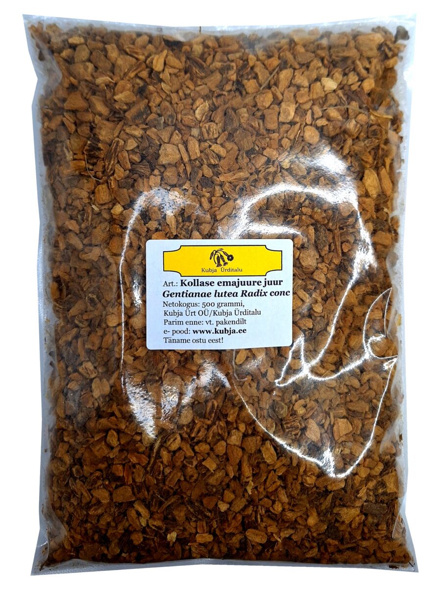 500 grammine pakk kollase emajuure – Gentianae lutea Radix conc. tükeldatud juurega.